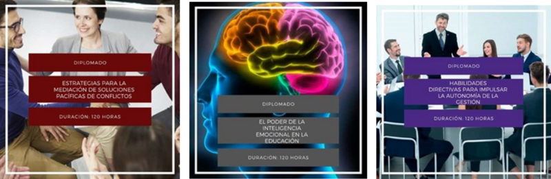 Mediadores en la solución pacífica de conflictos” El liderazgo y la calidad educativa”, Satisfacción laboral clave del éxito en un centro educativo”, Gestión y Desarrollo Educativo Resolución de conflictos en el aula y manejo de personas negativas”, Dirección de equipos colaborativos proactivos El estrés docente y directivo como prevenirlo y afrontarlo